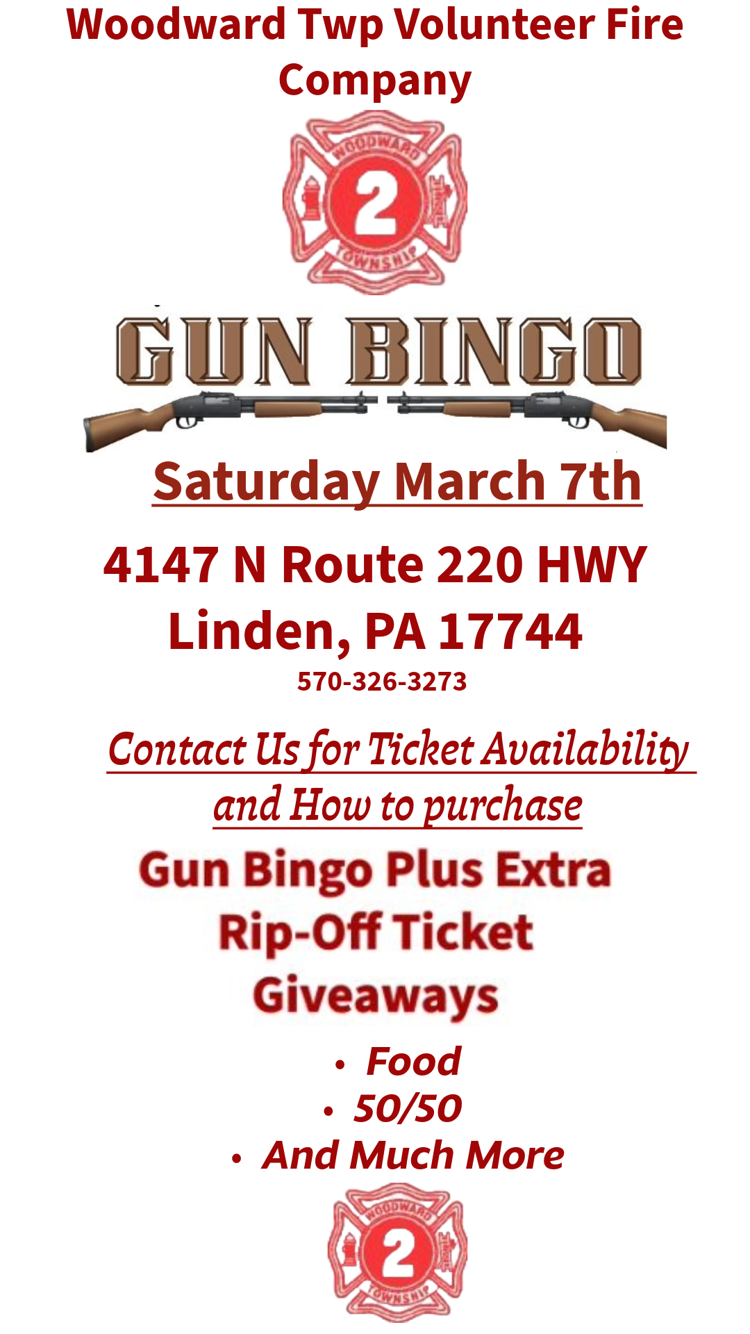 The Woodward Township Volunteer Fire Company is looking for people that would like to make a difference in their community and help others. We are looking for Firefighters, EMT's, Fire Police and fund raising personel. If interested stop by the station any Monday night at 7:00 PM or call 570-326-3273 for information.